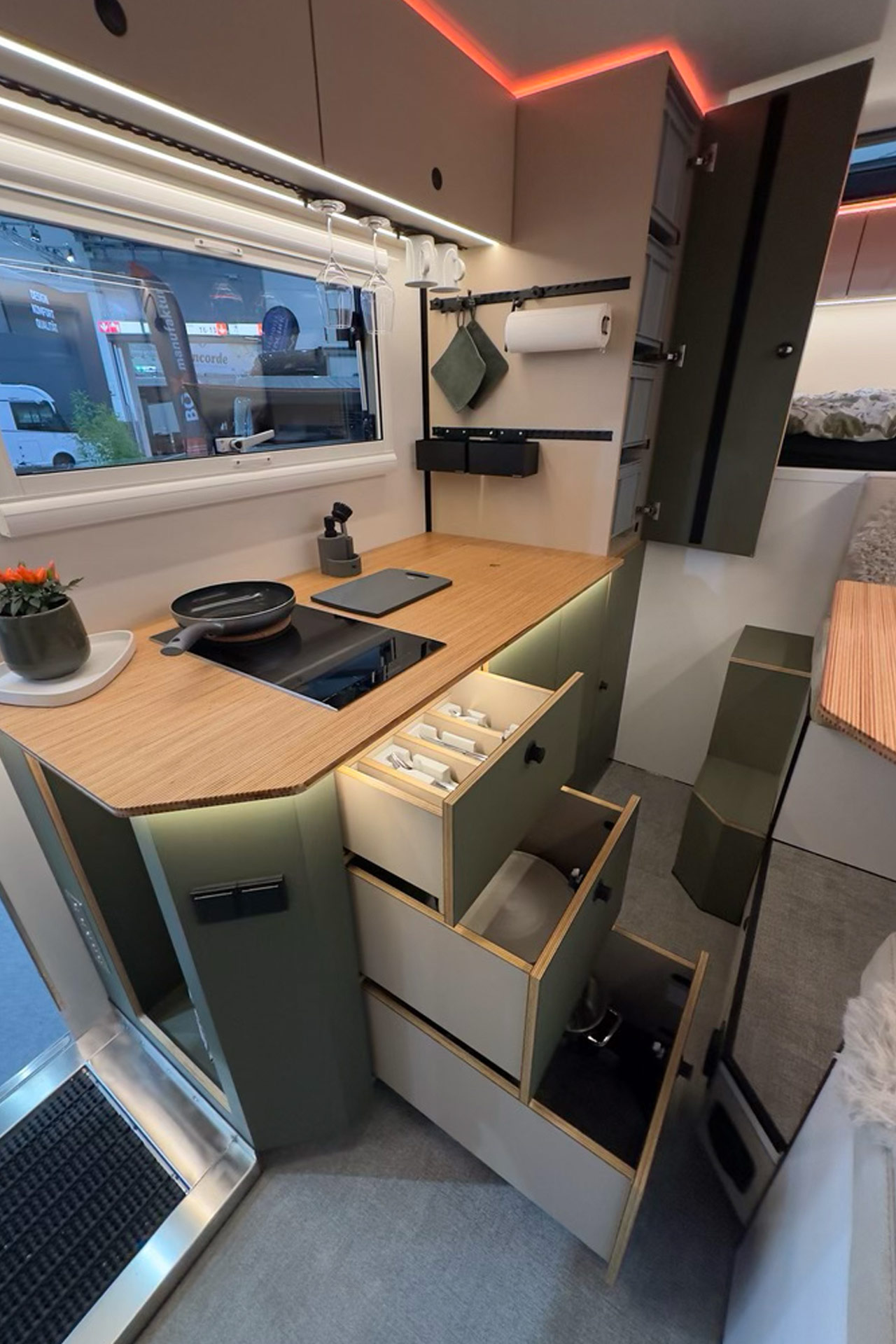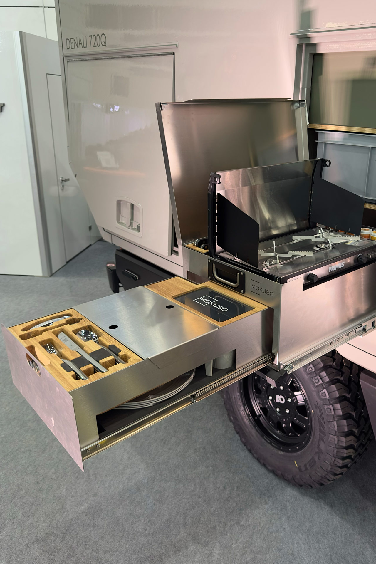 Das Energiesystem liefert 10 kWh LFP-Kapazität, gespeist von 525 Wp Solarleistung – ideal für autarkes Reisen. Auf Wunsch rüstet die Boxmanufaktur mit dem CA Tuned Offroad-Paket den Denali 720 Q für Expeditionen fernab asphaltierter Straßen auf.