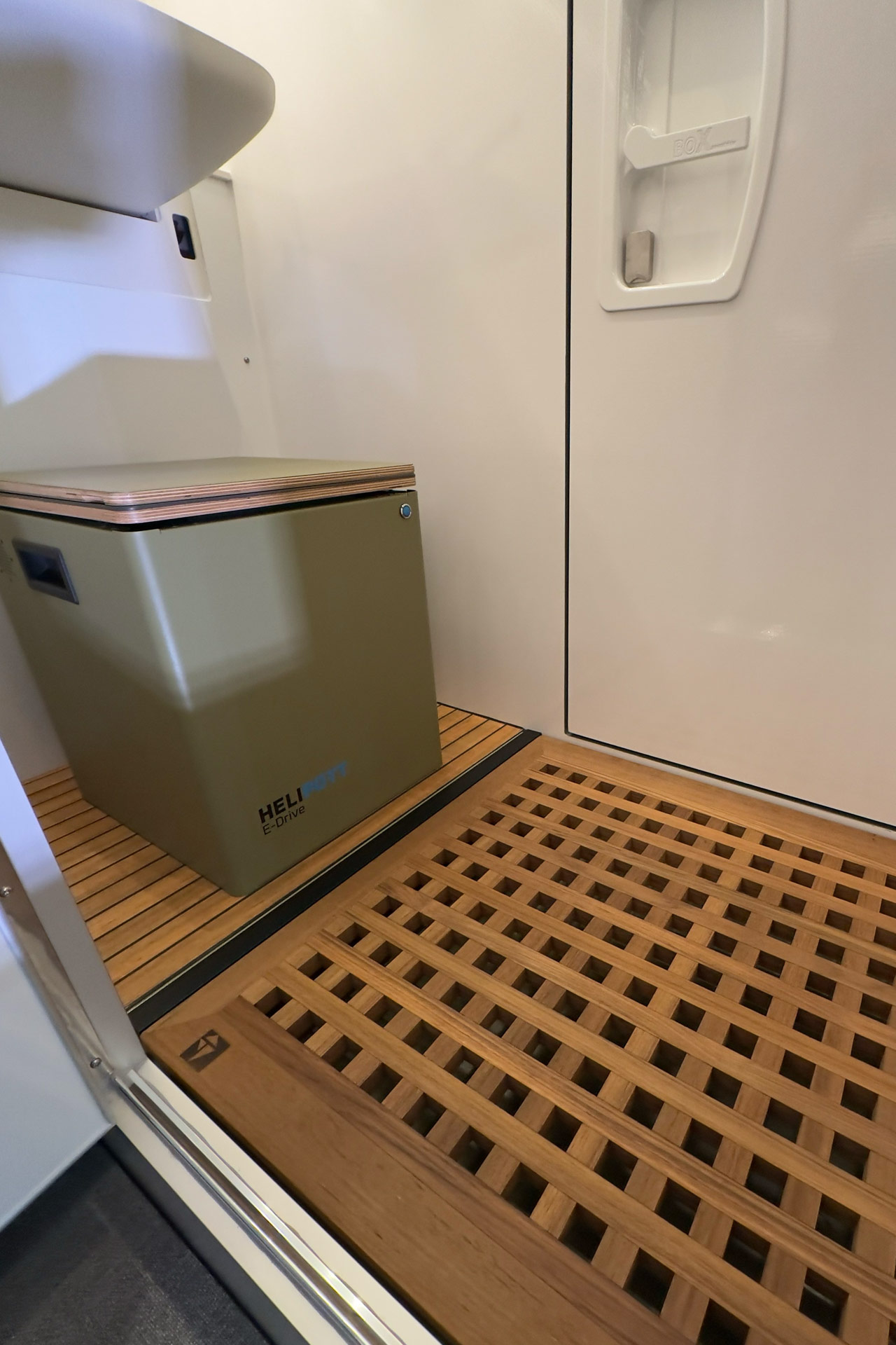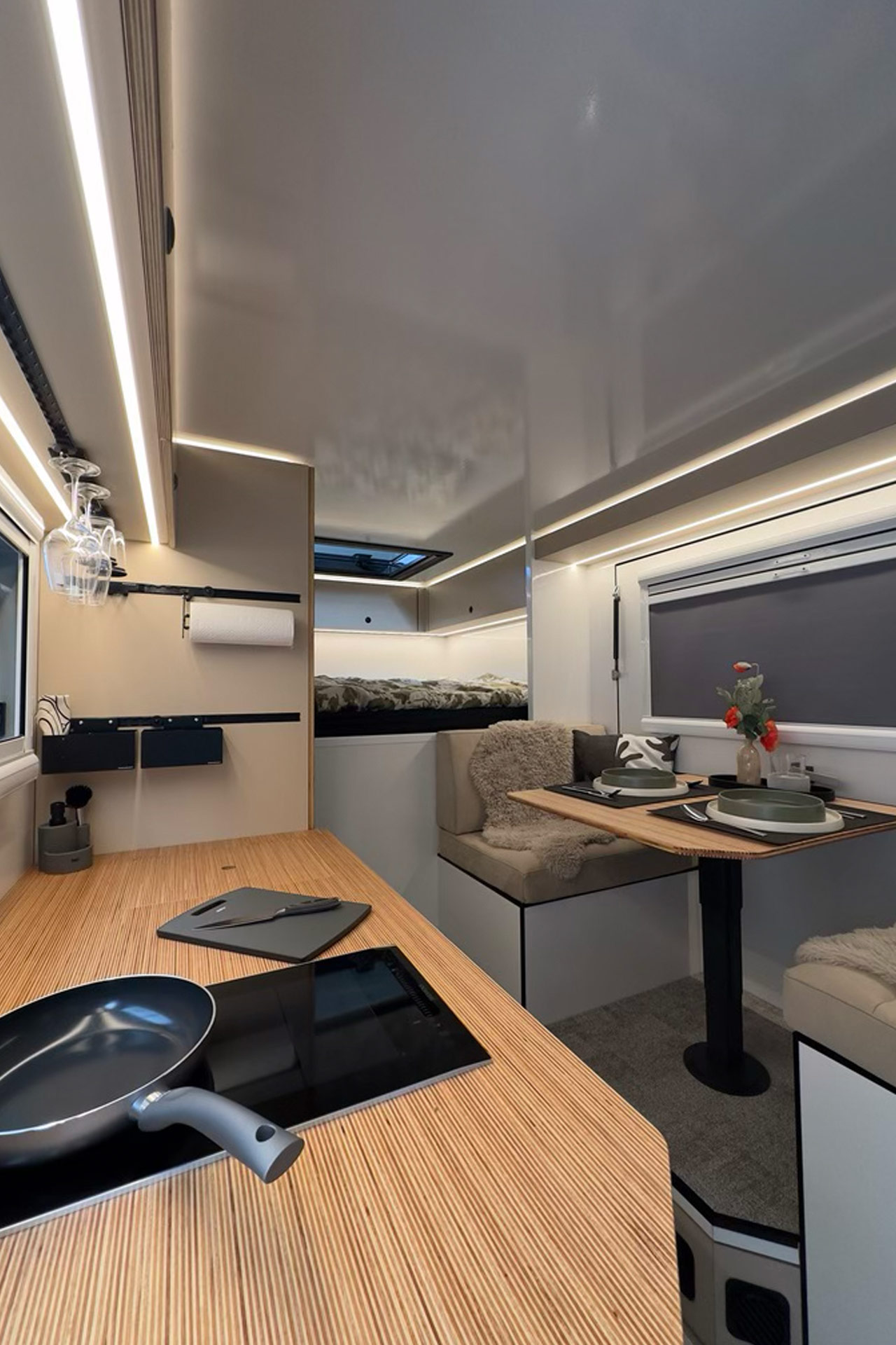 Innen trifft Leichtbauholz auf geölte Sichtkanten, dezente LED-Beleuchtung und intelligente Stauraumlösungen. Eine dieselbetriebene Warmwasserheizung mit Fußboden- und Wandtemperierung sorgt für Wohlfühlklima zu jeder Jahreszeit.