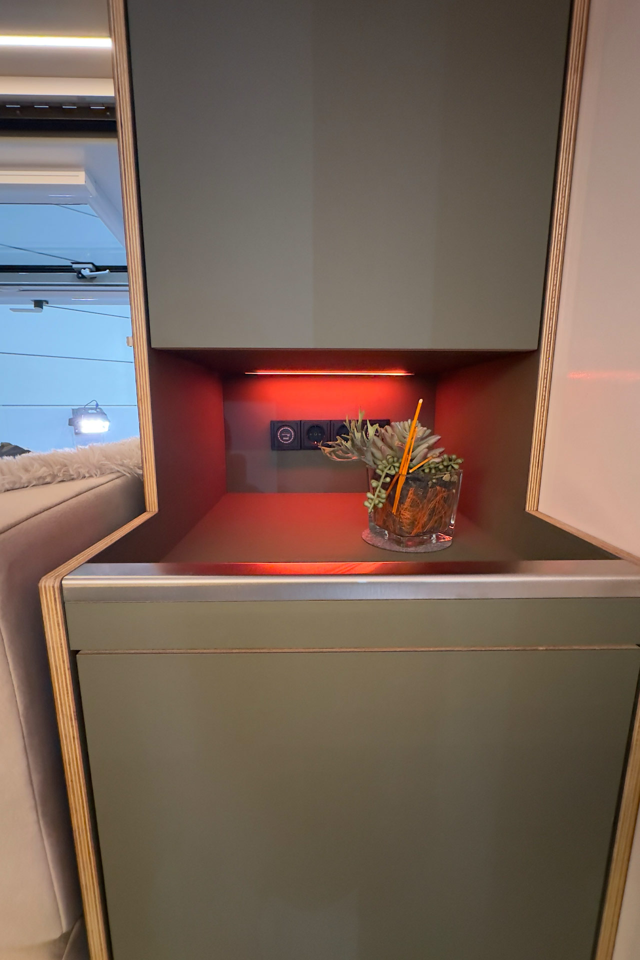 - Innenausbau: Manufakturqualität, Queenply-Leichtbau, LED-Lichtkonzept, Komfortbad, vollwertige Küche